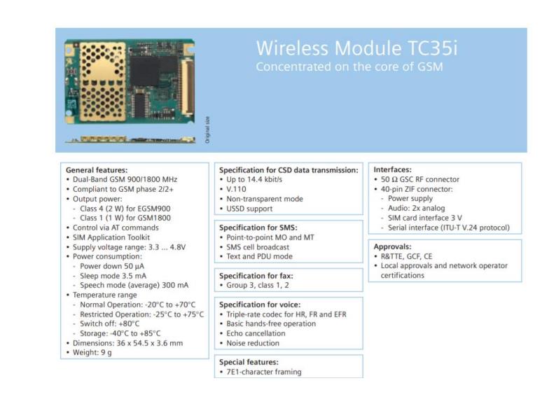 The TC35i is a GSM module with basic connectivity enabling voice and fax communication as well as applications with a low data transfer volume. Being purely designed for GSM communications, the TC35i is especially suitable for use in payphones and desktop phones.